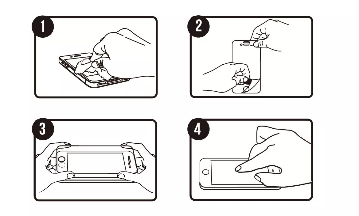 3)Почистете екрана: Всички протектори съдържат в комплекта си кърпички – една кърпичка напоена с алкохол и една суха. Обикновено са номерирани като 1 и 2. Винаги номер 1 - мократа кърпичка, а номер 2 – сухата. Почистете добре дисплея от прах и мръсотия, като следвате номерацията на кърпичките. Макар и миниатюрни, прашинките могат да попречат на протектора да залепне добре.